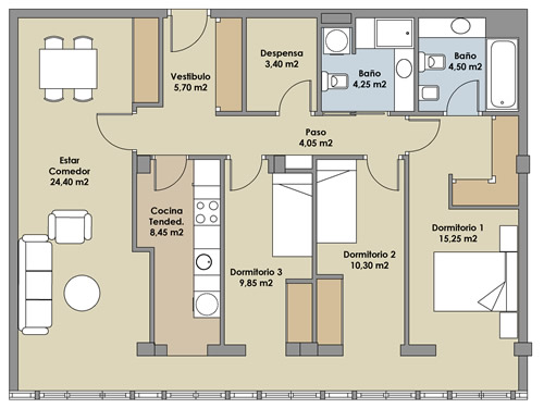 Piso 3 dormitorios y 2 baños (71 m2 + 13 m2 terraza)